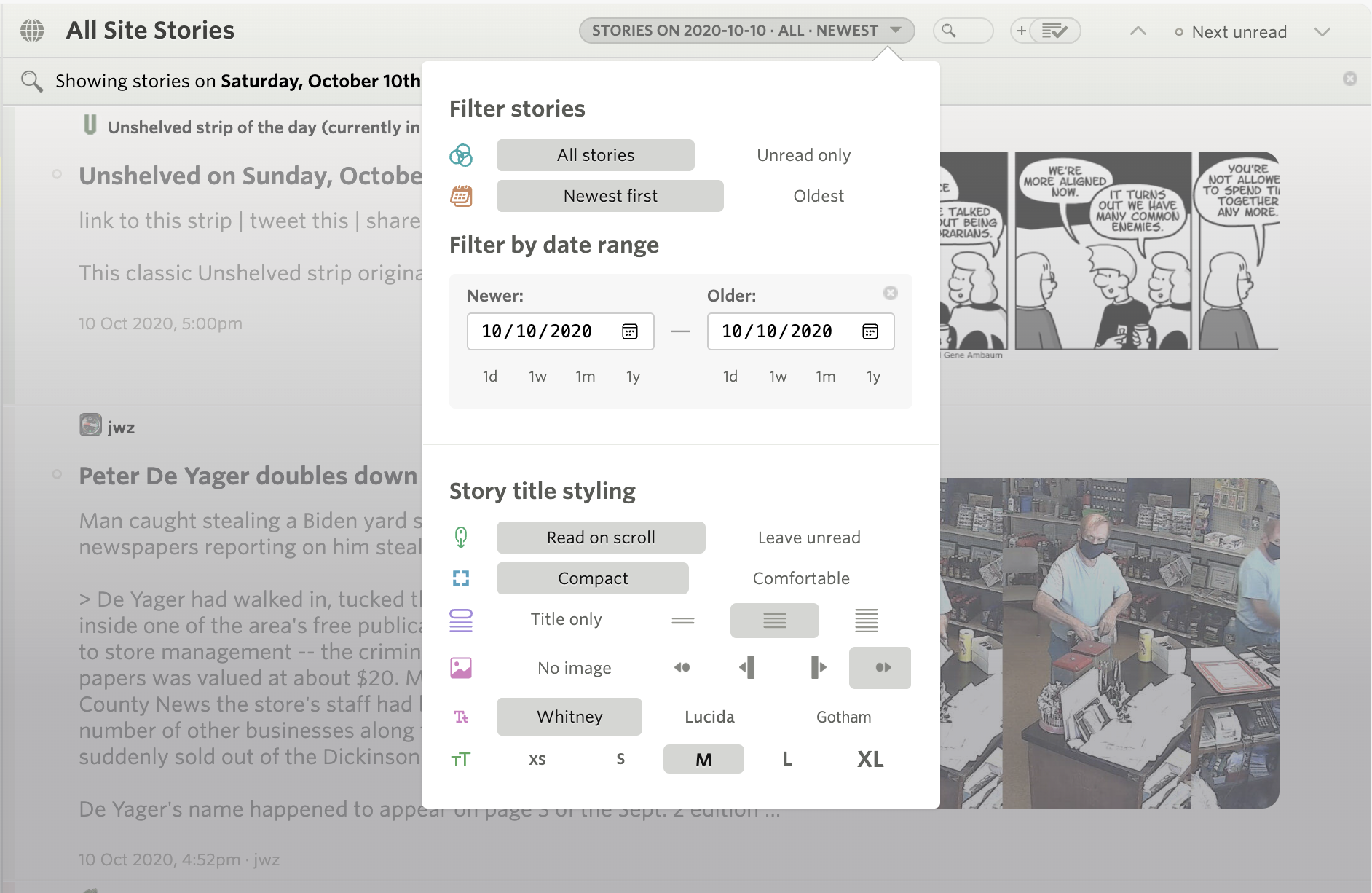You can now filter stories by date range, filtering stories down to only those newer or older than some date or between some timespan. This works on individual feeds and as well as on folders, saved stories, and read stories.