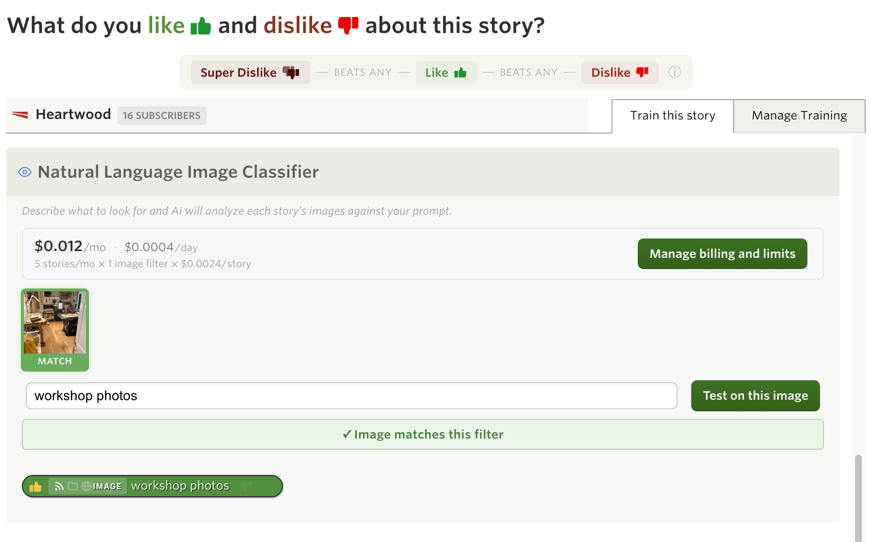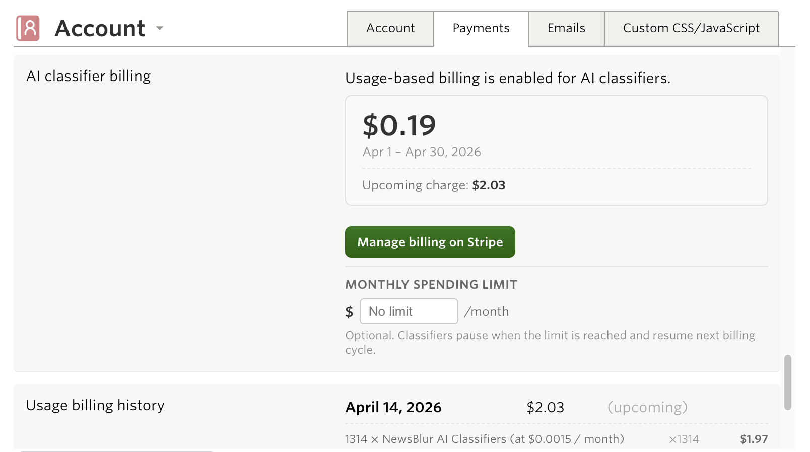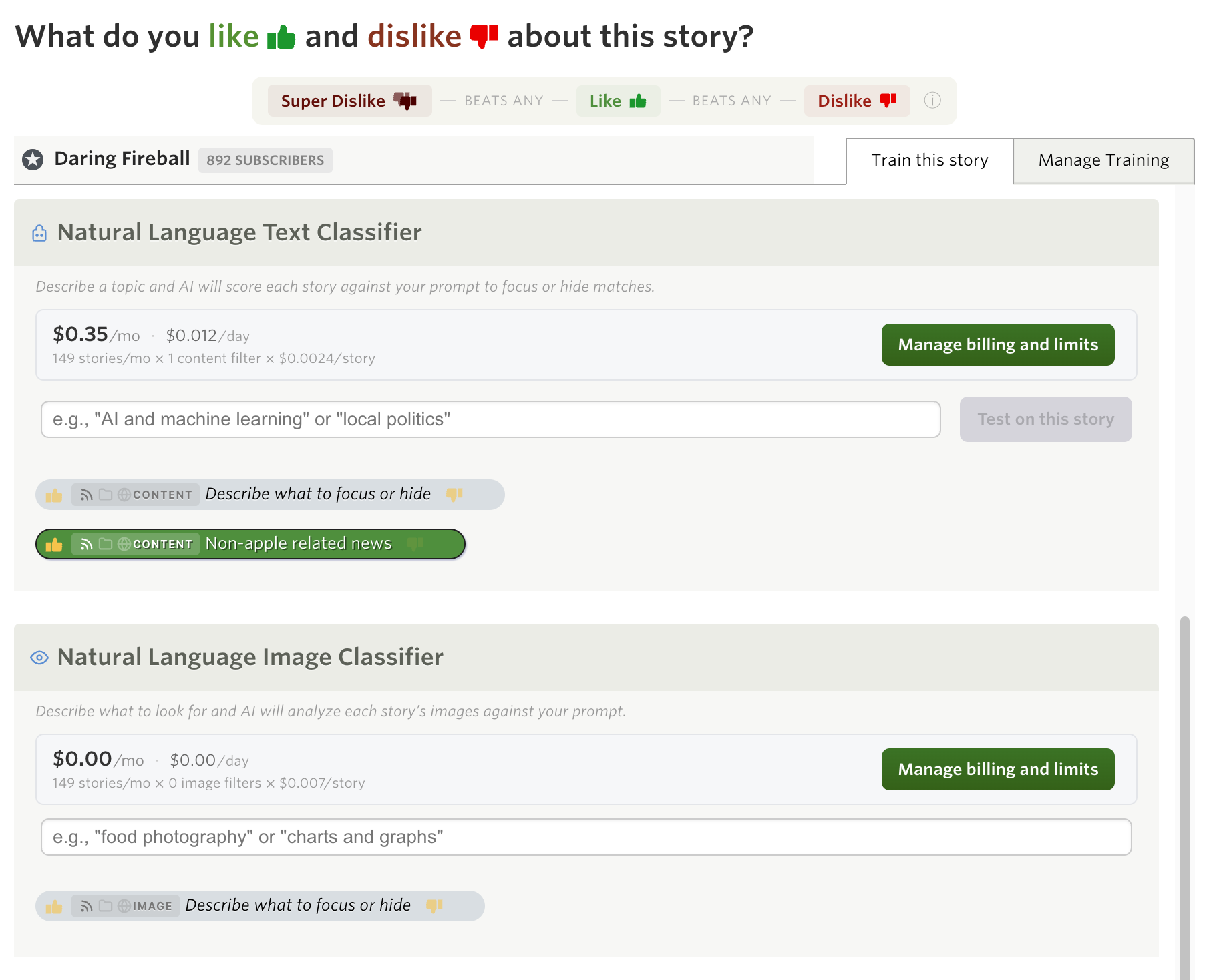 Natural language classifiers use AI models to evaluate every story, which means there’s a real cost per classification. Rather than bundling this into a fixed subscription tier, NewsBlur uses usage-based billing so you only pay for what you use.