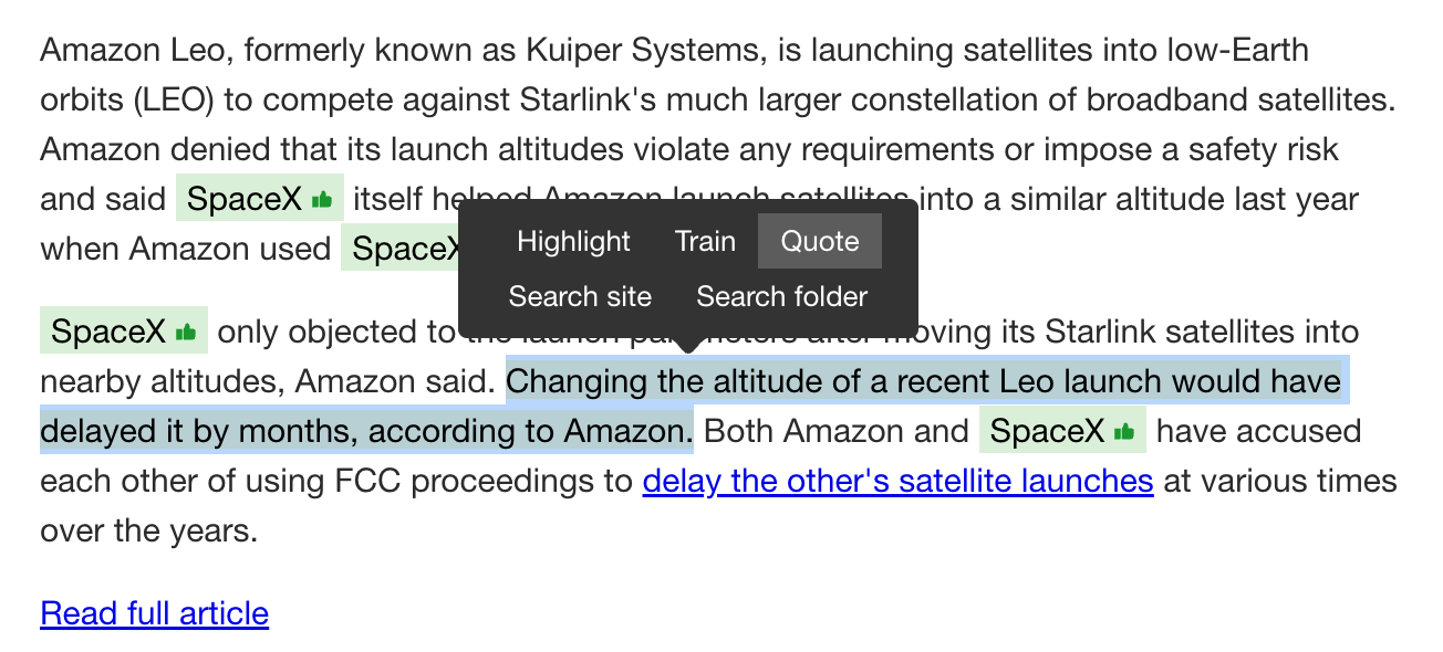 Select text in any story and a popover appears with the usual options: Highlight, Train, and Search. There’s now a new option: Quote. Click it, and the share dialog opens with your selected text rendered as a blockquote above the comment field.