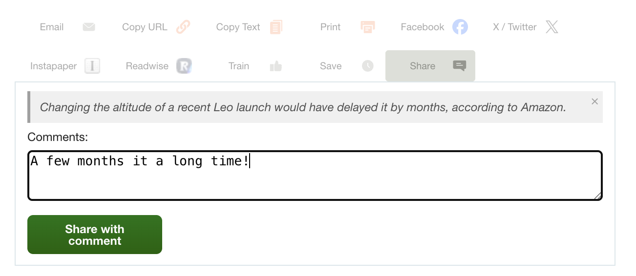 Add your own comment below the quote, or just share the quote by itself. The share button updates to say “Share with comment” when there’s a quote or comment present. If you change your mind, click the × on the blockquote to remove it.